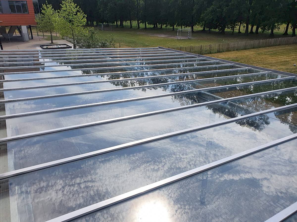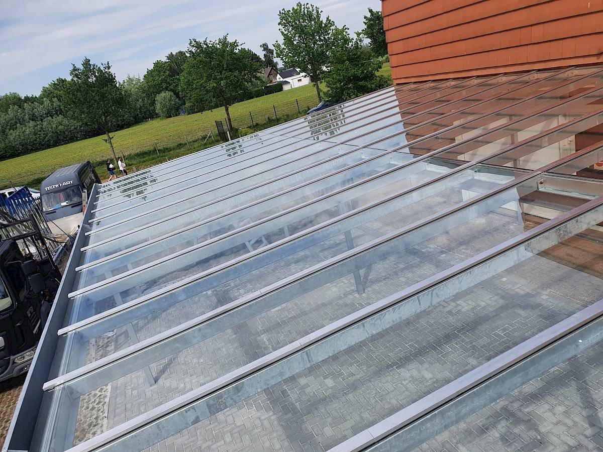 Aan het knappe gebouw van het 'Kiempunt' in Assenede werd een ruime glazen luifel gezet die mooi integreert met de stijl van het gebouw.